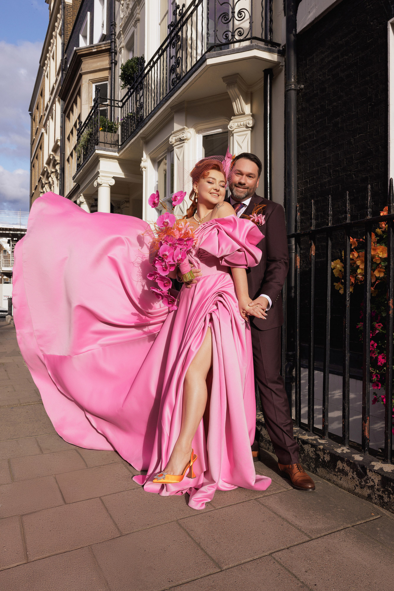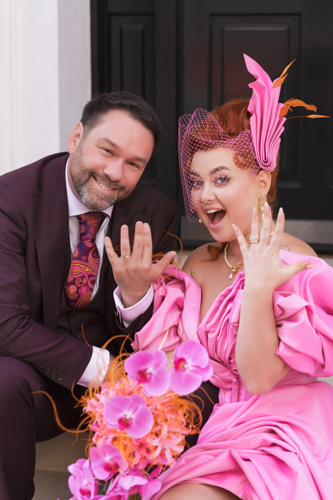 Її букет став поемою про любов. Класична форма зі шлейфом, як у принцеси Діани, орхідеї — як у королеви Єлизавети. Основу склали ніжно-рожеві лілії Наріне — символ жіночої сили, чистоти й відродження. Помаранчевий ковиль додав легкості та нагадував про Крим, звідки вона родом, і про українські традиції. Каскад орхідей символізував любов, що росте й розквітає, а три повітряні квітки — три роки їхнього кохання. Весілля відбулося саме на третю річницю знайомства.